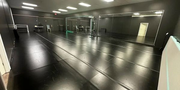 This studio is approximately 1500 sqft. It has sprung floor, marley, sound bar, and LED lights around the room. This studio could be used for a large rehearsal space and large classes.